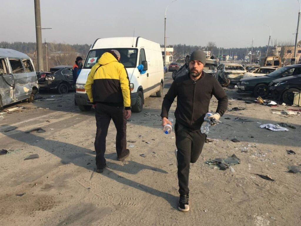 Коли все почалося, не вірилось навіть, що йде війна. Падають снаряди, а ти живеш в паралельній реальності. Їдеш по Ірпеню за кимось [вивозити], а воно собі падає, вибухає. Нічого не можеш з цим зробити, бо ти в машині їдеш і вплинути на це не можеш. Ти просто собі зосередився на тому, що треба. Думаю, що Бог захищає, дає реакцію на події. Захищає психіку або щось. Були вже вбиті люди і вони лежали просто по вулицях міста. Але ти на це не звертаєш уваги, тому що є люди, які живі, і це переважно діти. Особливо на початку це жінки, діти, яких треба було масово вивозити.